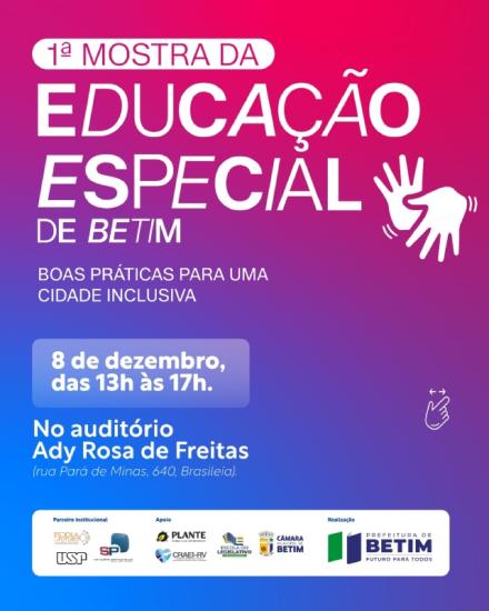 A Prefeitura de Betim, por meio da Secretaria Municipal da Educação, da Secretaria Adjunta de Inclusão e do Centro de Referência e Apoio à Educação Inclusiva Rafael Veneroso (Craei-RV), realiza, no próximo dia 8 de dezembro, a 1ª Mostra da Educação Especial de Betim: Boas Práticas para uma Cidade Inclusiva. O encontro, que será realizado no auditório Ady Rosa de Freitas, dentro da prefeitura, das 13h às 17h, é aberto à comunidade escolar e à população.